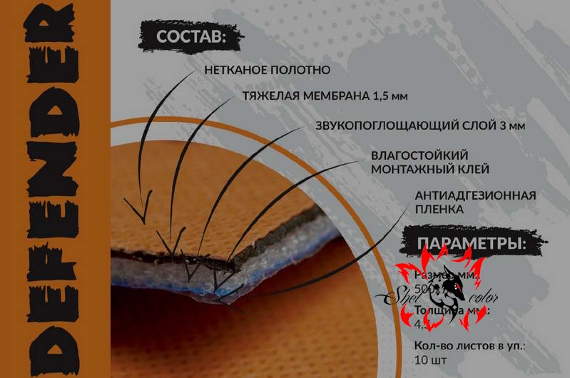 Defender предназначен для звукоизоляции дверей автомобиля. Материал укладывается вторым слоем поверх виброизоляции. Особенность новинки – малый вес (существенно меньше, чем у других мембран), что позволяет рекомендовать ее для звукоизоляции пола авто любых марок и моделей. Удобный монтаж материала обеспечивается за счет особого клеящего слоя AdiT с эффектом герметика.