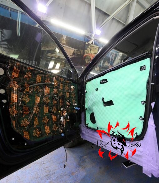 Материал должен наноситься на чистую, обезжиренную подготовленную поверхность. Рекомендуем первым слоем использовать мастичный материал, а вторым уже непосредственно данный продукт. Толщина материала зависит от области применения. Предварительно вырежьте кусок материала необходимого размера. Аккуратно оторвите антиадгезионное покрытие. Приложите материал к поверхности. Тщательно разгладьте, ведь важно, чтобы между поверхностью и материалом не было воздушных пузырей. Мягкие материалы, в отличии от виброизоляции, желательно приклеивать стык в стык — это позволит избежать проблем при сборе обшивки обратно.