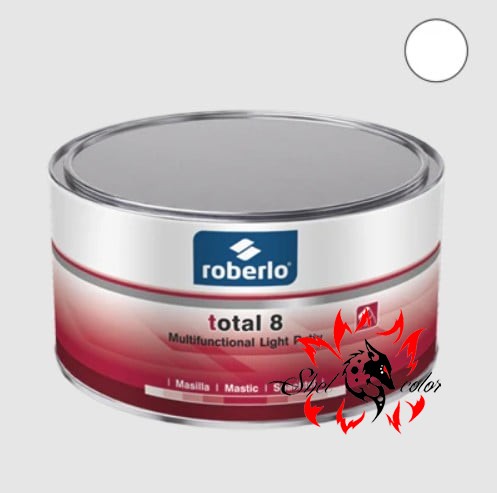 Roberlo TOTAL 8-легкая, универсальная полиэфирная шпаклевка. Её кремовая текстура позволяет легко и удобно использовать шпатлевку для больших поверхностей. Мелкодисперсная структура шпатлевки позволяет сделать шлифование более легким. Шпатлевка обладает отличными шлифовальными свойствами и позволяет обеспечить качественную поверхность. Основным преимуществом по сравнению со стандартными полиэфирными шпатлевками является её хорошая адгезия, как к оцинкованным металлам, так и к алюминию. Её превосходная адгезия достигается при сохранении всех качеств, предъявляемых к хорошей шпатлевке, таких как удобство применения, быстрая сушка и легкое шлифование (начиная с абразивной бумаги P120).