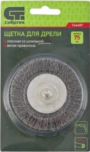 Плоская щетка для дрели Сибртех 744487 диаметром 75 мм, со шпилькой, с щетиной из витой проволоки 0,3 мм, используется для щадящей обработки металлических, деревянных и пластиковых поверхностей. Удаляет загрязнения, ржавчину, старые лакокрасочные покрытия. Благодаря плоской форме щетка идеально подходит для очистки труднодоступных мест, пазов, изгибов, внутренних углов. Хвостовик диаметром 6 мм устанавливается в патрон дрели. Рекомендуемая скорость вращения 4500 об/мин. Во время работы следует использовать средства индивидуальной защиты. Щетку применяют во время строительства, ремонта, а также в быту.
