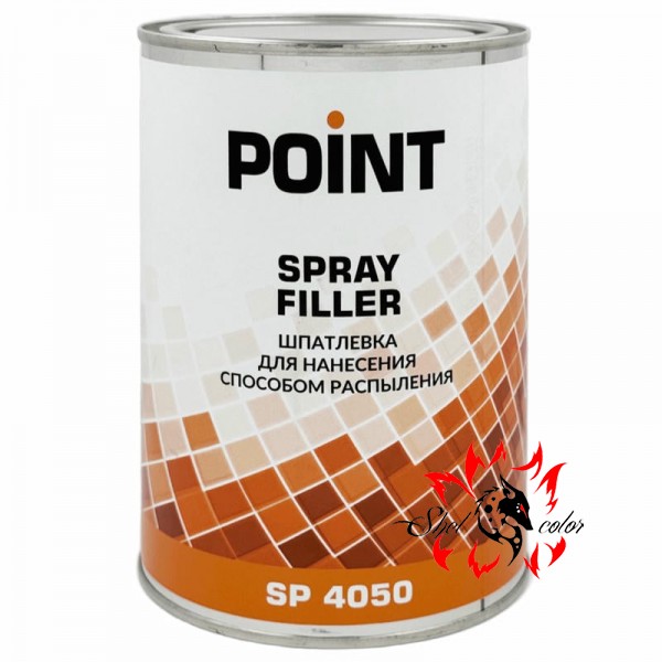 Двухкомпонентная серая жидкостная наполняющая шпатлевка для использования с краскопультом и прилагаемый отвердитель (коэффициент смешивания 100:6-7) – POINT SP 4050 0.8л. Характеризуется значительной укрывистостью с сохранением ровной поверхности на крупных участках. Подвергается шлифованию мелкозернистым абразивом через 2 часа после распределения. Допустимо нанесение на: полиэфирные шпатлевки, пластики (исключая PE, PP и PTFE), сталь, алюминий, двухкомпонентные акриловые грунты, прежние ЛКП. Не рекомендуется прямое нанесение на реактивные грунты, однокомпонентные акриловые и нитроцеллюлозные составы.