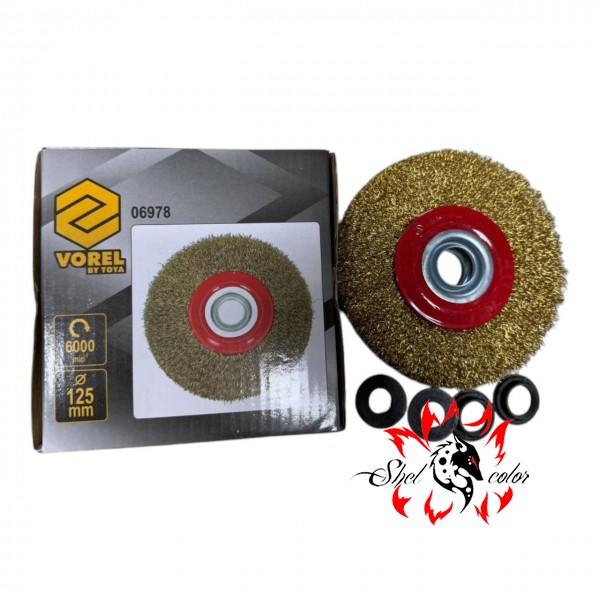 Щётка-крацовка плоская 125 мм Vorel 06978, мягкую проволочную насадку диаметром 125 мм для шлифовальных машин, используемую для обработки металла, дерева, алюминия и других материалов.